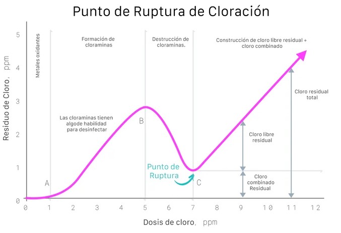 Para maximizar el uso del cloro y reducir sus costos de adición, se utiliza el método de ruptura, que significa agregar cloro al agua hasta alcanzar el punto de ruptura, que es cuando toda la materia orgánica del proceso ha reaccionado con el cloro para formar cloro combinados. Una vez alcanzado el punto de ruptura se puede agregar cloro adicional para llegar a la cantidad de cloro residual deseada.