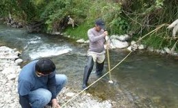 Primero, se divide en secciones, un área transversal al rió accesible de la corriente de agua (ver diagrama). Por ejemplo, en cada una de las siete secciones se mide el ancho y el promedio de la profundidad.